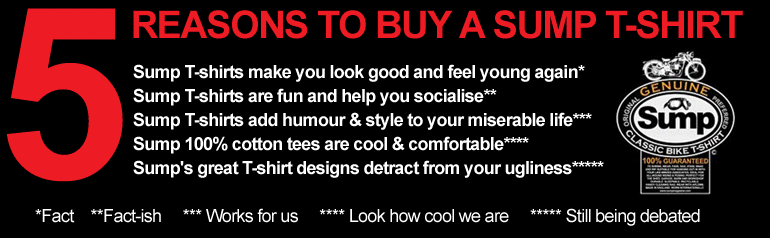 Cool bikerT-shirtsfrom Sump We spend hours crafting our cool biker T-shirts. Days sometimes. Of course, when you see the finished article, it's easy to think; "Hell, I could've done that!". But it ain't so easy when you're sat in front of your computer scratching your nether end and looking for inspiration. Fortunately, you don't have to do either. All you need to do is make your selection and follow the links. These are all original designs. And there are a few more to choose from when you visit our main Sump T-shirt page. We generally despatch the next day—unless it's a Saturday, in which case we'll despatch the follow Monday. OK? Check the links below for details: 1. BEEZA GEEZA biker T-shirt £12.99 2. Genuine Sump biker T-shirt £14.99 3. BSA M20 biker T-shirt £12.99 4. Triumph Bonneville biker T-shirt £14.49 5. Triumph 865 biker T-shirt £19.99 Note: All prices are plus postage and packing